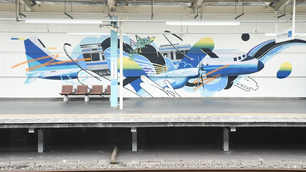 駅は、ミューラルアートの事例がもっとも分かりやすい場のひとつです。毎日多くの人が通り、遠くからでも視認できる大きな壁面があるため、壁画が「その駅らしさ」や「街の顔」をつくる役割を担います。