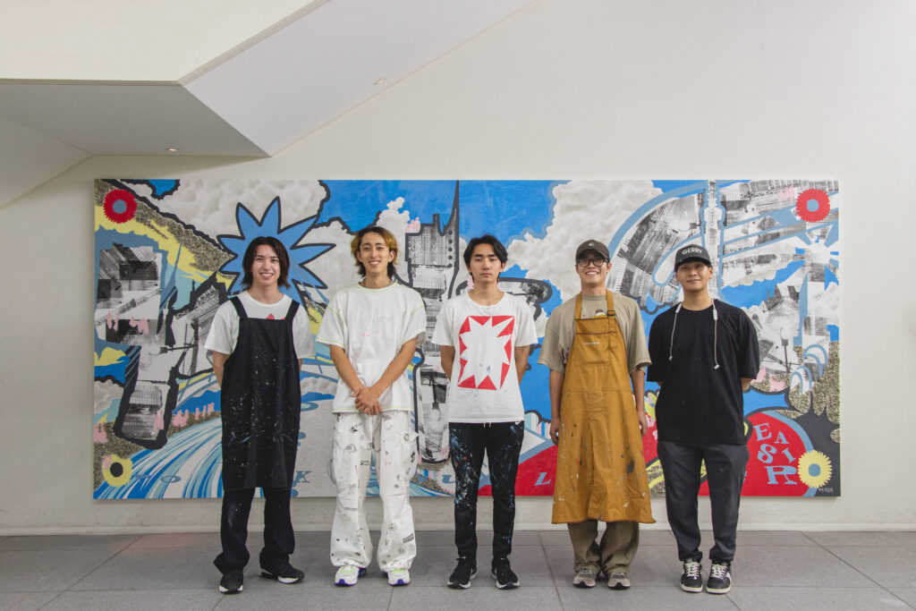 今回の壁画制作は、若きアーティストチームによって実現しました。メインアーティストの赤佐氏利を筆頭に、アシスタントとして根本竜希、小林勇斗、北沢誠太郎、浅井諒馬、そしてカメラマンの野秋勇太が参加。