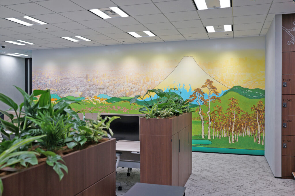田村久美子さんの美しく華やかな色合いは実際にリアルに制作した油絵をスキャンし、さらに写真と組み合わせるなどの過程を経て、シートとして施工。角を曲がるたびに魅せる違う表情が、社員の皆様を楽しませることを期待しています。